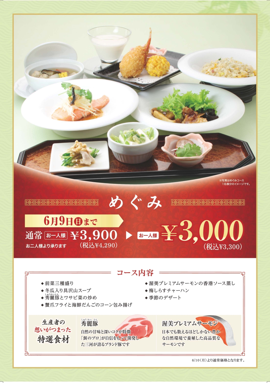 6月3日(月)から9日(日)までの7日間だけ、大人気のコース「めぐみ」がお得にお召し上がりいただけます!