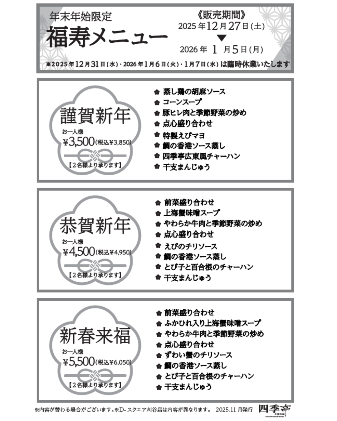 年末年始メニューのお知らせ